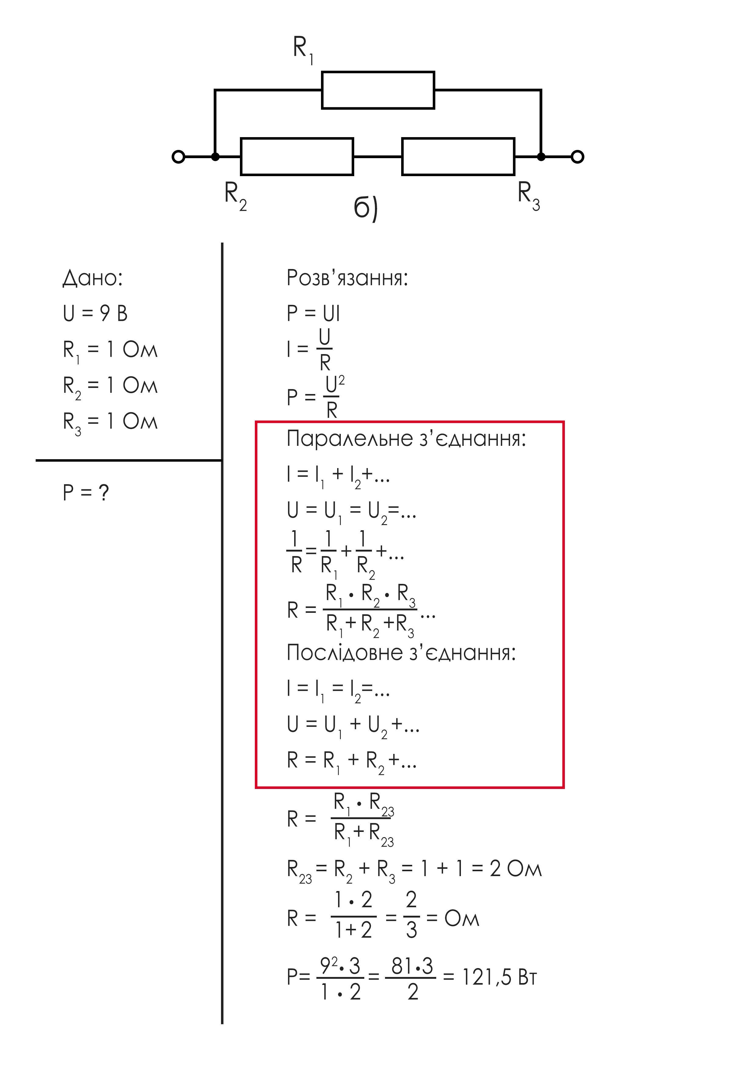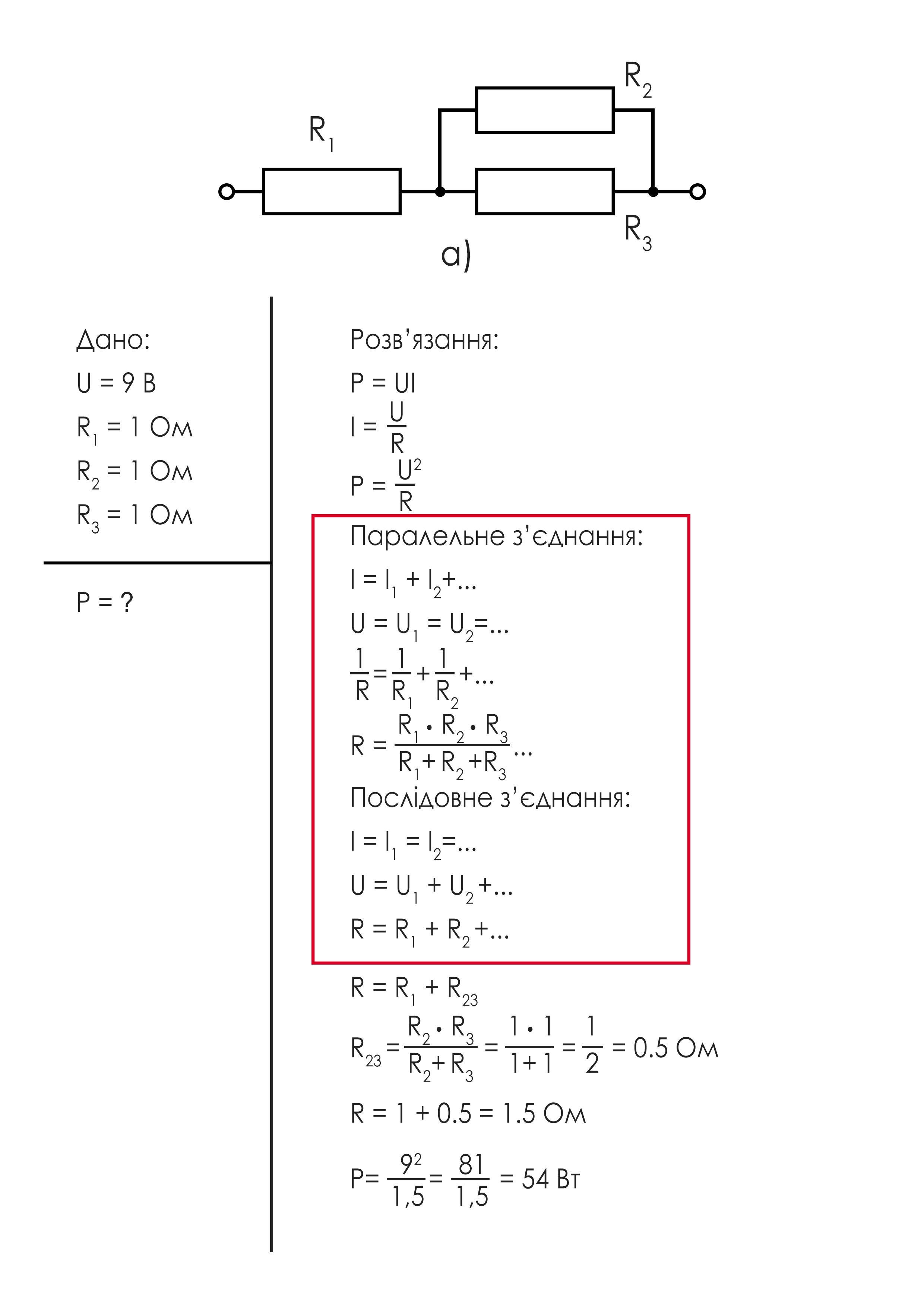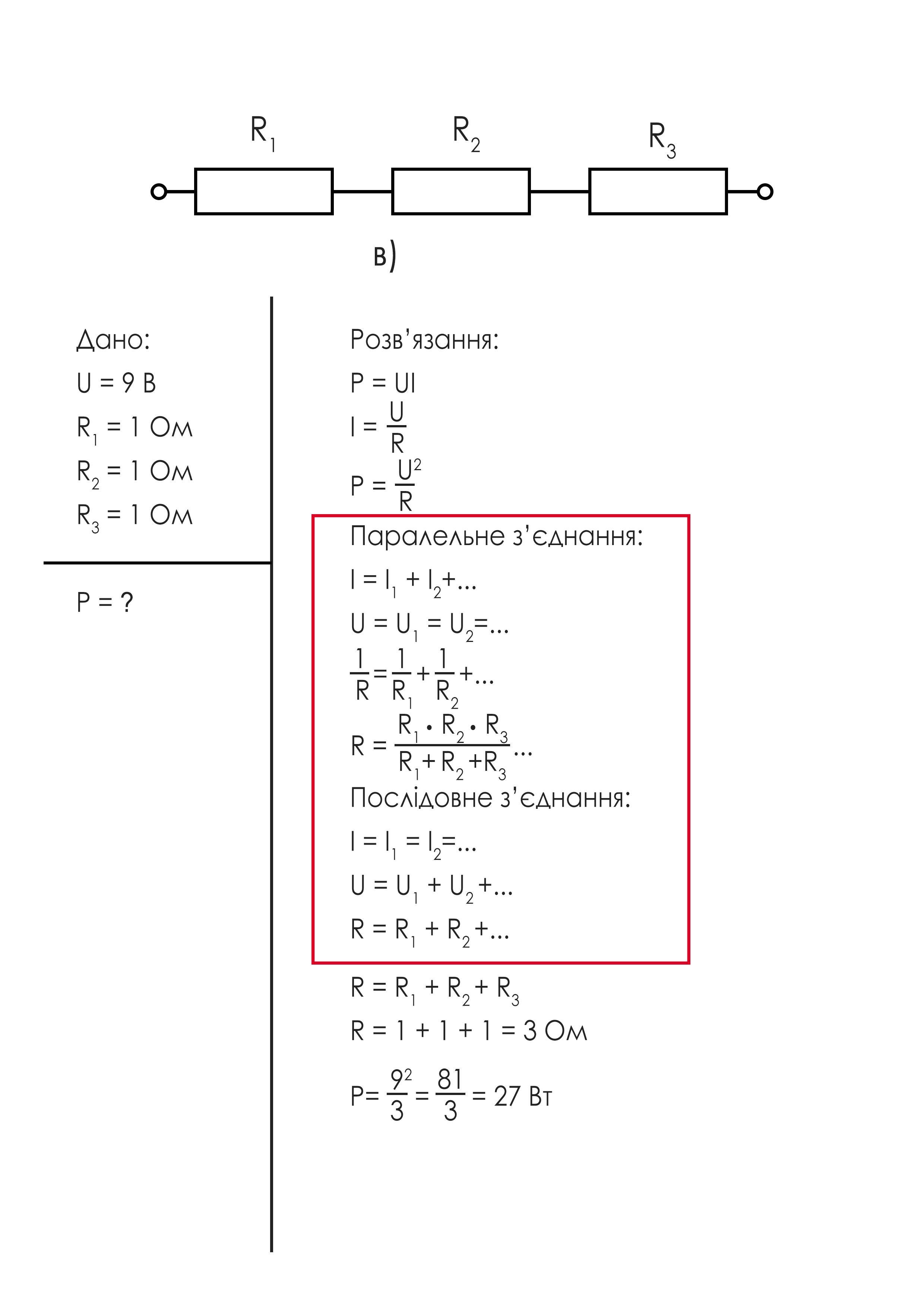 До джерела постійної напруги 9B підключили три однакові резистори по 1 Ом (мал. 186). Визначте потужність електричного струму в кожному із