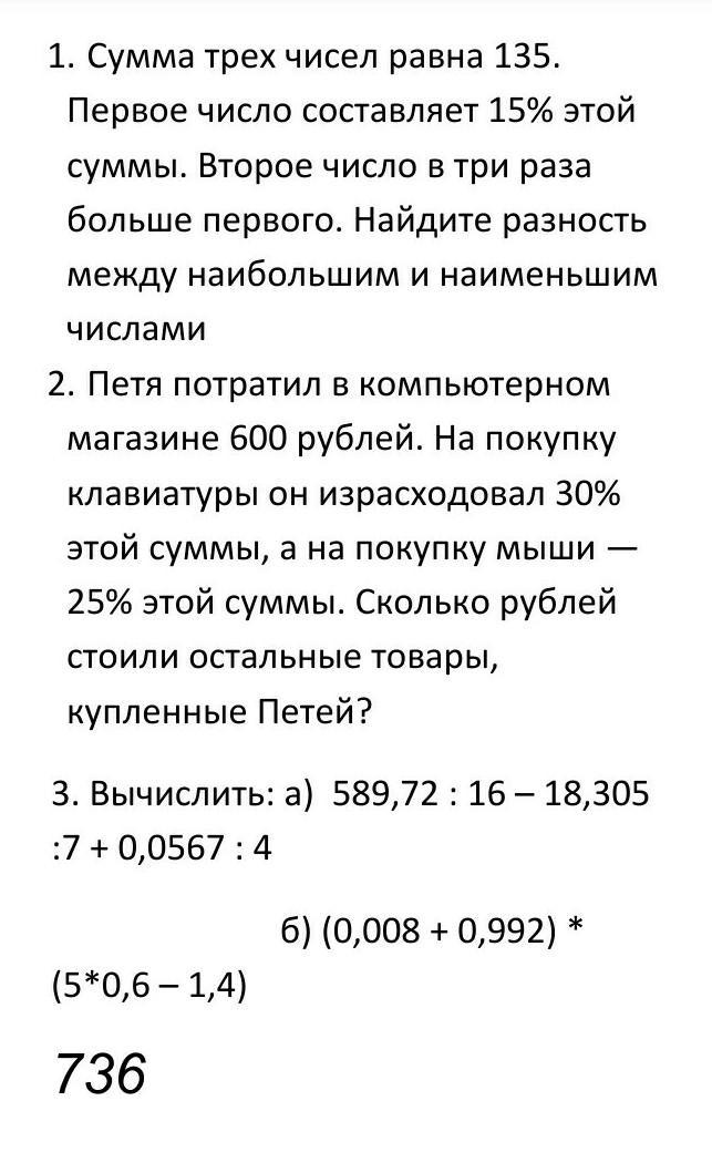 135•0,15=20,25 первое число 2)20,25•3=60,75 второе число 3)135-(20,25+60,75)=135-81=54 Ответ 54 третье число