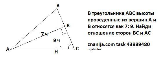 В треугольнике ABC высоты проведенные из вершин A и B относятся как 7: 9. Найди отношение сторон BC и AC