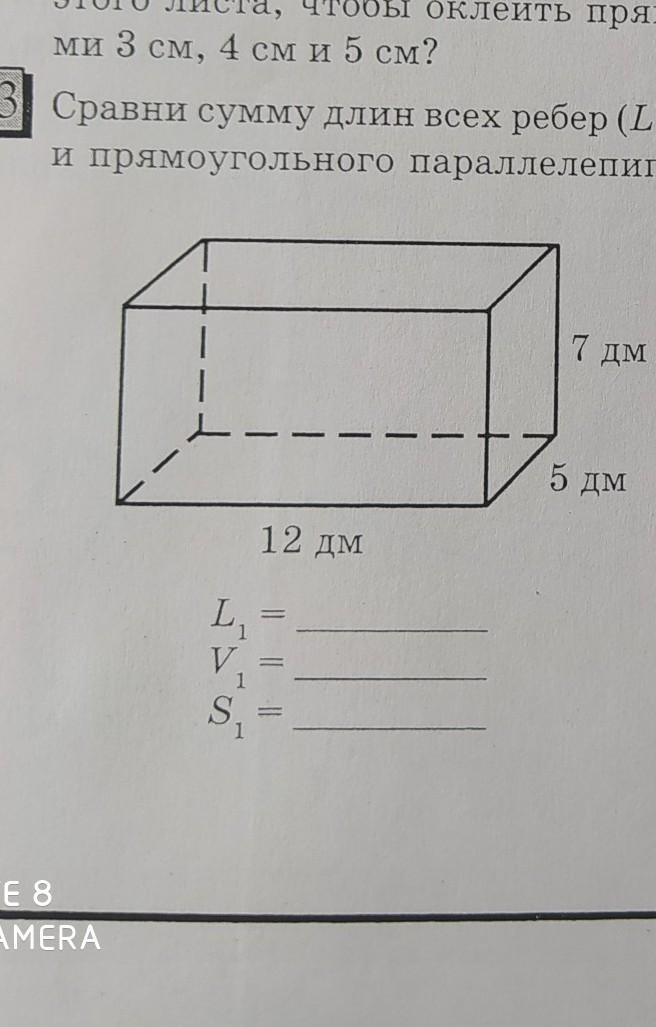 Сравни сумму длин всех ребер(L), Объем и площадь если высота равна 7 дм, широта 5 дм, длинна 12дм