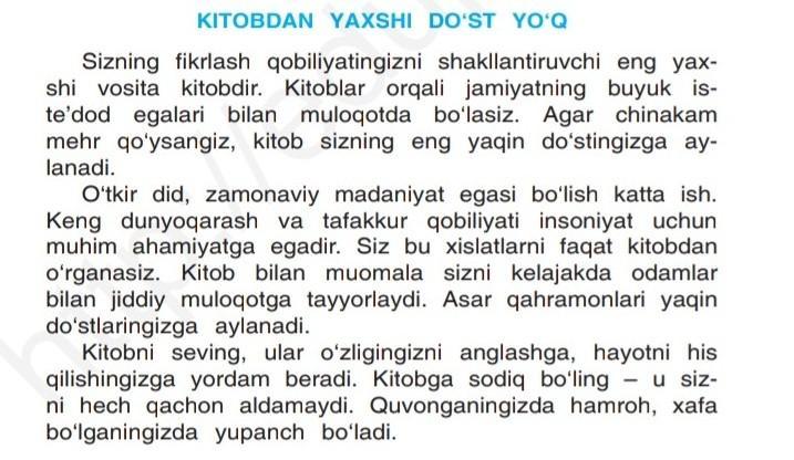 2 албатта китоб бизнинг дустимиз сабаби ундан доно киши йукдир Алишер Новоий хам китобниуз дустидак куради ва у кишконтай пайтидан бери китобни куп укийдиганли
