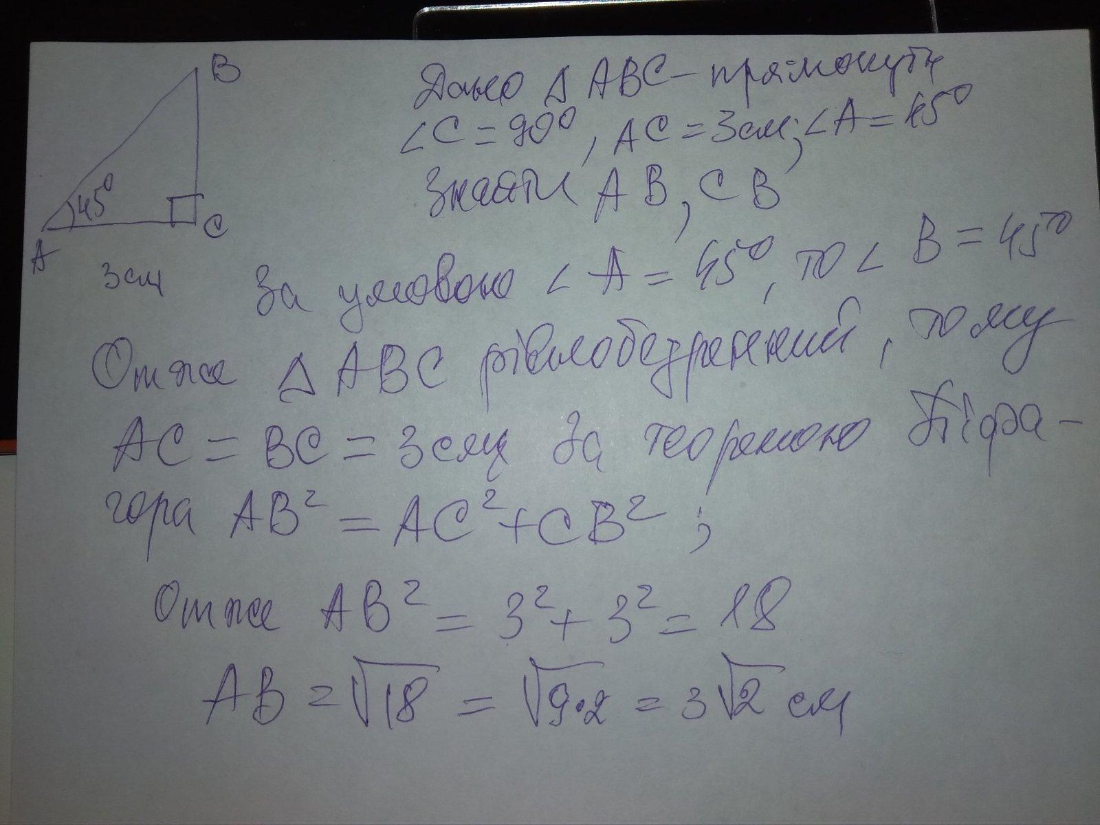 Знайти невідомі сторони прямокутного трикутника АВС (кут С=90°),якщо АС=3см, кут А=45°