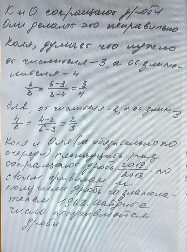 1)2018-1968=50(на это число уменьшился знаменатель). Так как уКоля знаменатель уменьшает на 4, А Оля на 3, то Коля сокращал дробь 5 раз,а Оля-10 раза