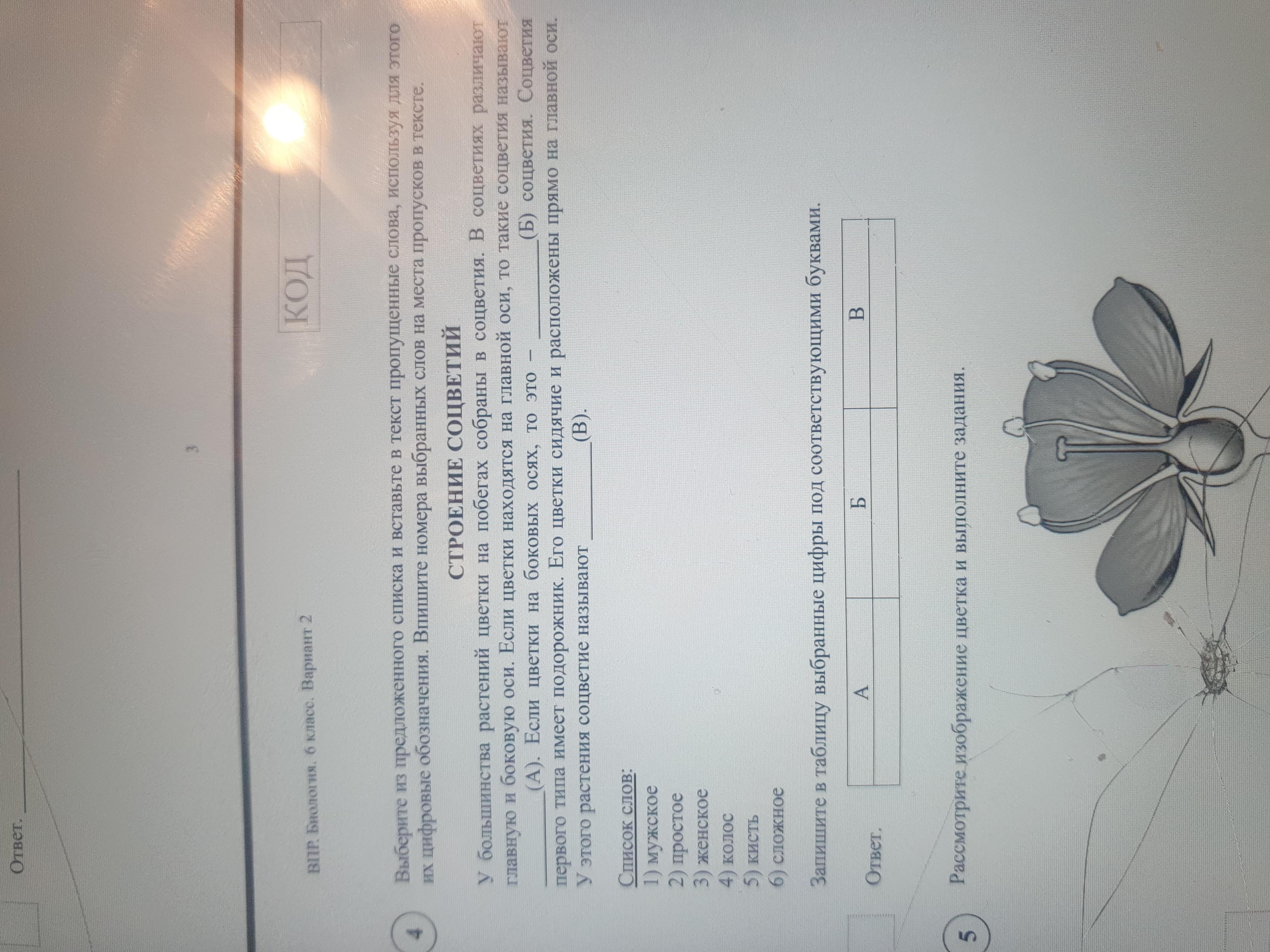 У большинства растений цветки на побегах собраны в соцветия. В соцветиях различают главную и боковую оси. Если цветки находятся на главной оси, то такие соцветия называют простое — 2 (А). Если цветки на боковых осях, то это — сложное — 6 (Б) соцветия. Соцветия первого типа имеет черёмуха, ландыш. Их цветки с цветоножками расположены поочерёдно на удлинённой оси. Такое соцветие называют кисть — 5 (В). Соцветия второго типа имеют овёс и сирень.
