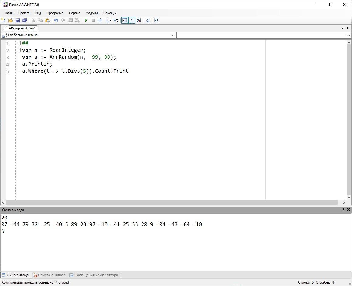 ## ArrRandom(ReadInteger, -99, 99).Println.Where(t -> t.Divs(5)).Count.Print
