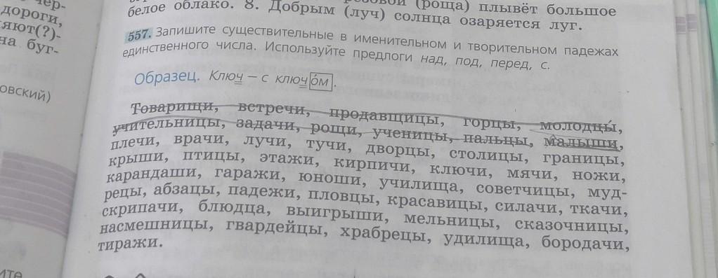 Товарищ - с товарищем, встречя - с встречей, продавец - с продавцом, молодец - с молодцом, учительница - с учительницей, задача - с задачей, ученица - с ученицей, палец - с пальцем, малыш - с малышом, плечо - с плечом, врач - с врачем, луч - с лучом, тучя - с тучей, дворец - с дворцом, столица - с столицей, граница - с границей, крыша - с крышей, птица - с птицей, этаж - с этажом, кирпич - с крпичом, клуч - с ключом, мяч - с мячом, нож - с ножом.