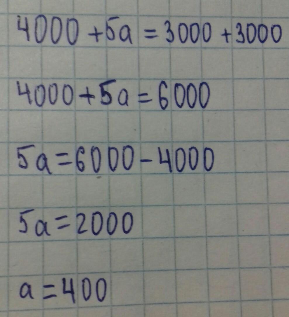 Проверка:4000+5(400)=3000+3000 4000+2000=6000 6000=6000
