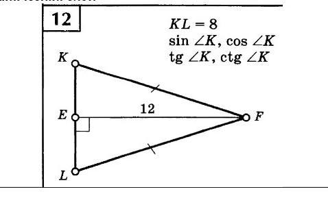 KE=4, тк высота в равнобедренном треугольнике является медианой/ По Пифагору KF=4V10 .Тогда .sinK=12/(4V10) ; соsK=4/4V10 ; tgK=12/4 ; ctgK=4/12