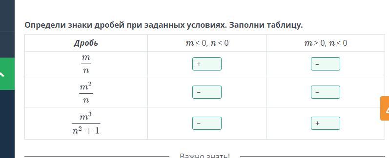 Определи знаки дробей при заданных условиях. Заполни таблицу.