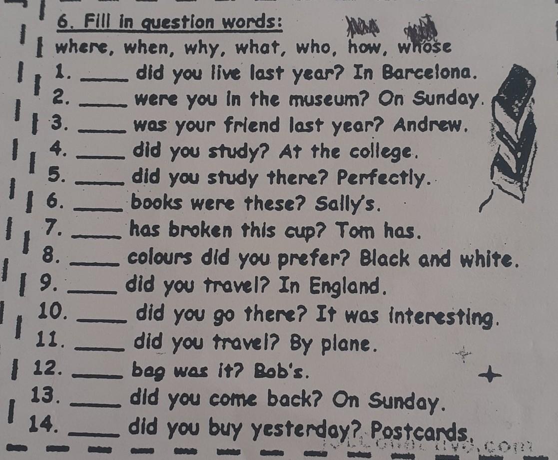 1. where 2. when 3. who 4. where 5. how 6. whose 7. who 8. what 9. where 10. why 11. how 12. whose 13. when 14. what