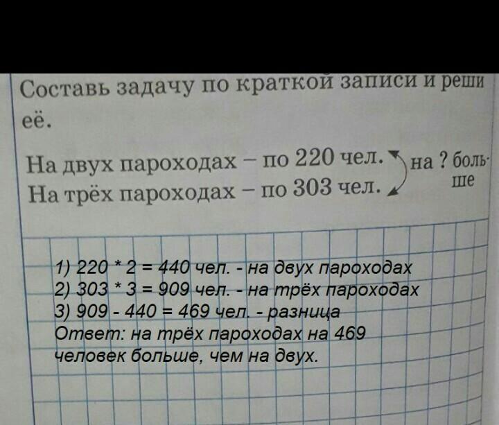Составь задачу по краткой записи и реши её. На двух пароходах по 220человек, на трех пароходах по 303 человка на ? больше. Помогите пожалуйста!!!