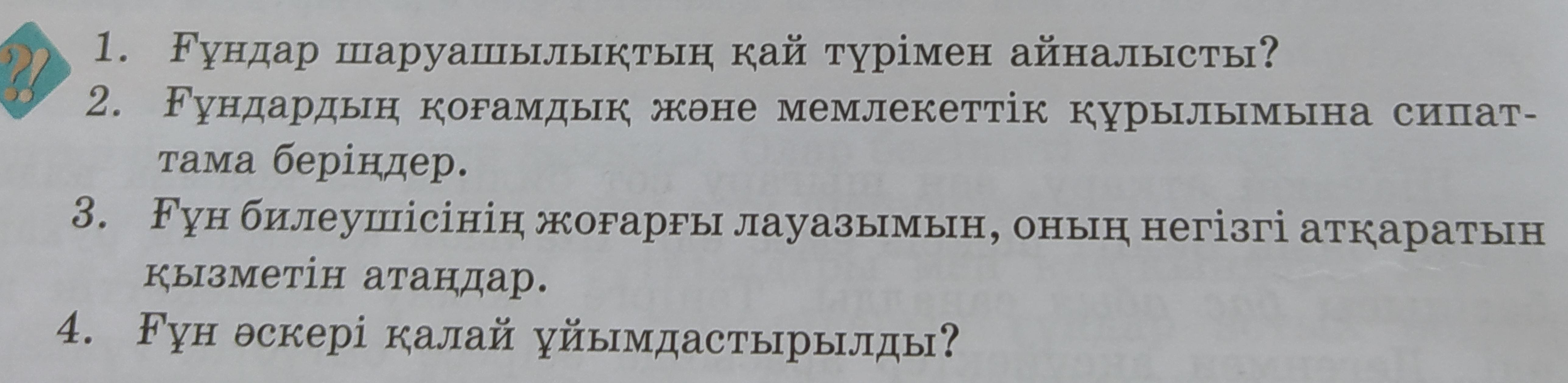 Помогите пожалуйста очень надо. 5 сынып Қазақстан тарихы. Ғұндардың шаруашылығы қоғамдық және мемлекеттік құрылымы!!!