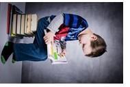 The boy sits on books, reads an educational book, from him we can say that he loves to read very much. Boy and Science.