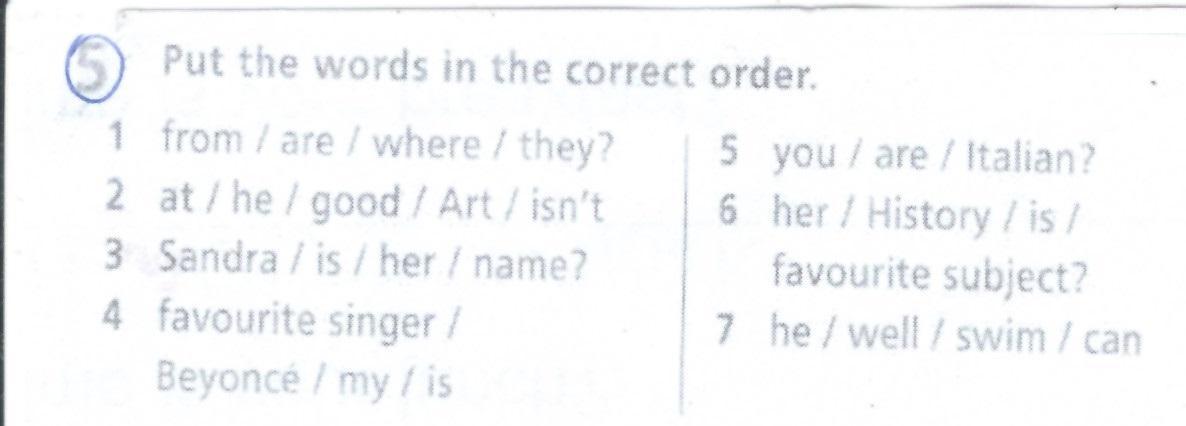 1.where are they from ? 2he isn't good at art ? 3is her name sandra? 4.my favourite singer is Beyonce 5 are you Italian? 6.is her favourite subject is history 7can he swim well?