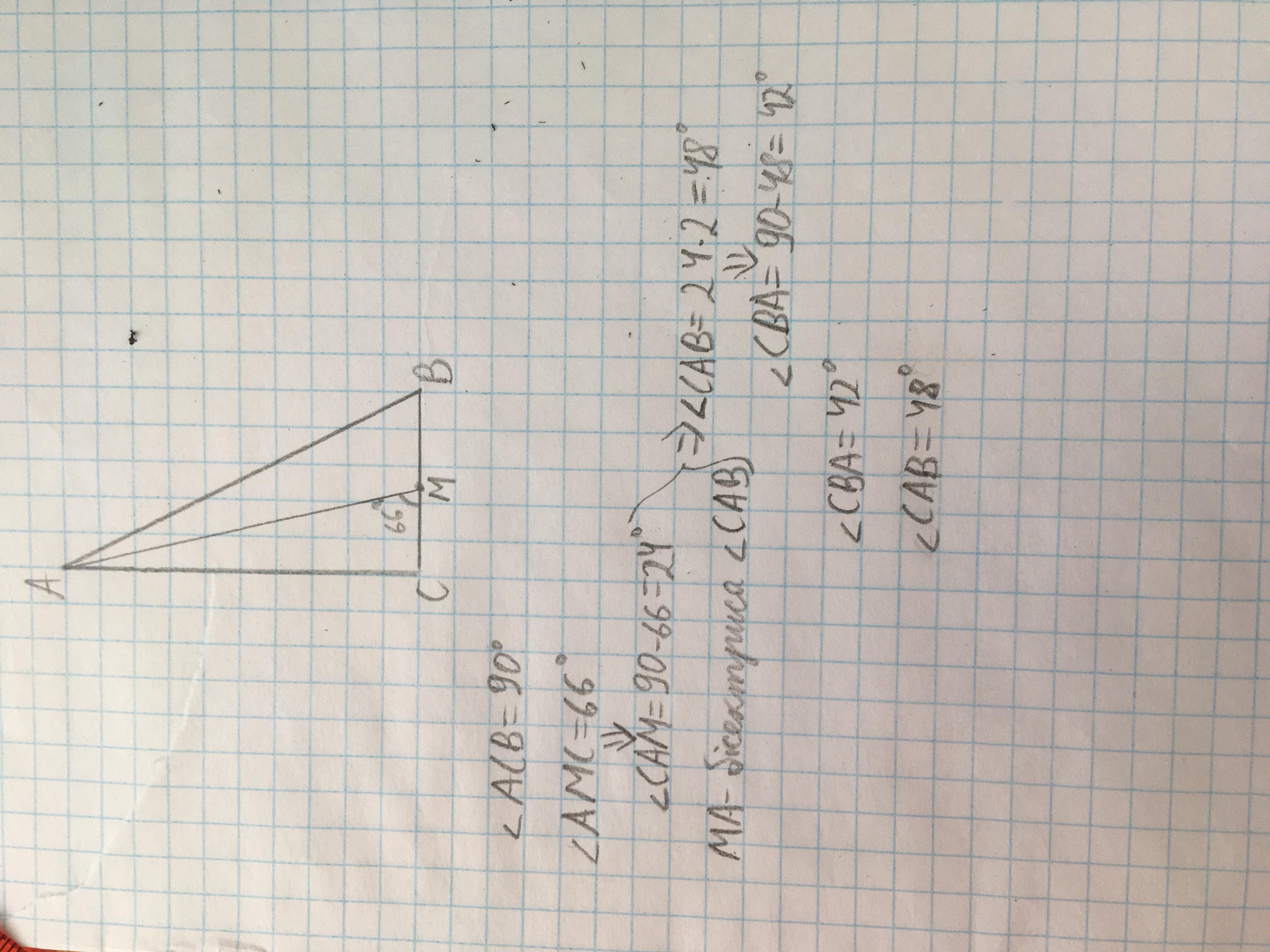 кут між бісектрисою AM і катетом CB прямокутного трикутника ABC (кут ACB=90°) дорівнює 66°.Знайдіть гострі кути трикутника ABC.