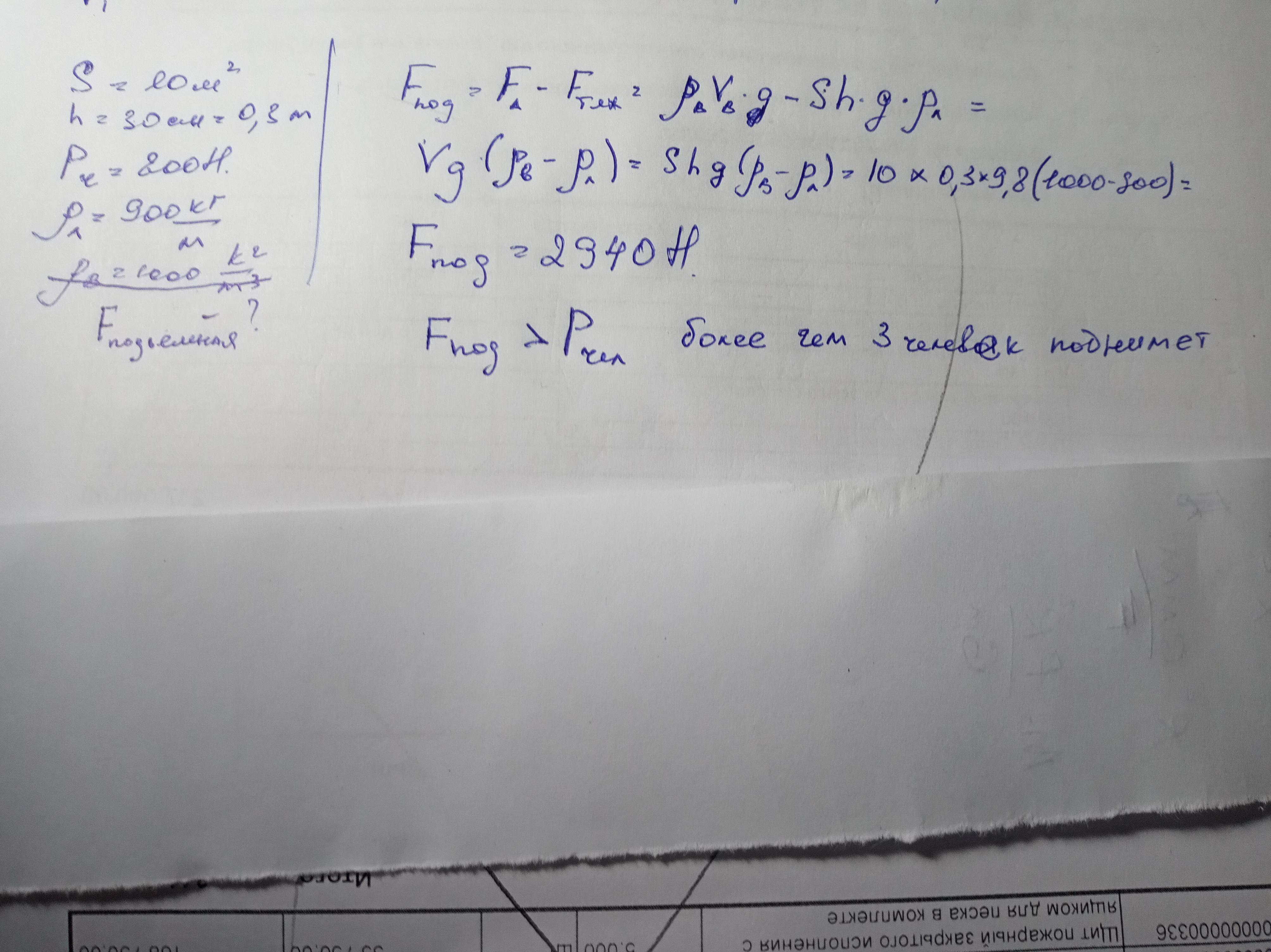 Площадь льдины 10 м2, толщина 30 см. Погрузится ли она целиком в пресную воду, если на неё встанет человек, вес которого равен 800 Н?