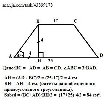 Один з кутів рівнобічної трапеції дорівнює втричі менший від іншого, а його основи дорівнють 17 см і 25 см. Обчисли площу трапеції.