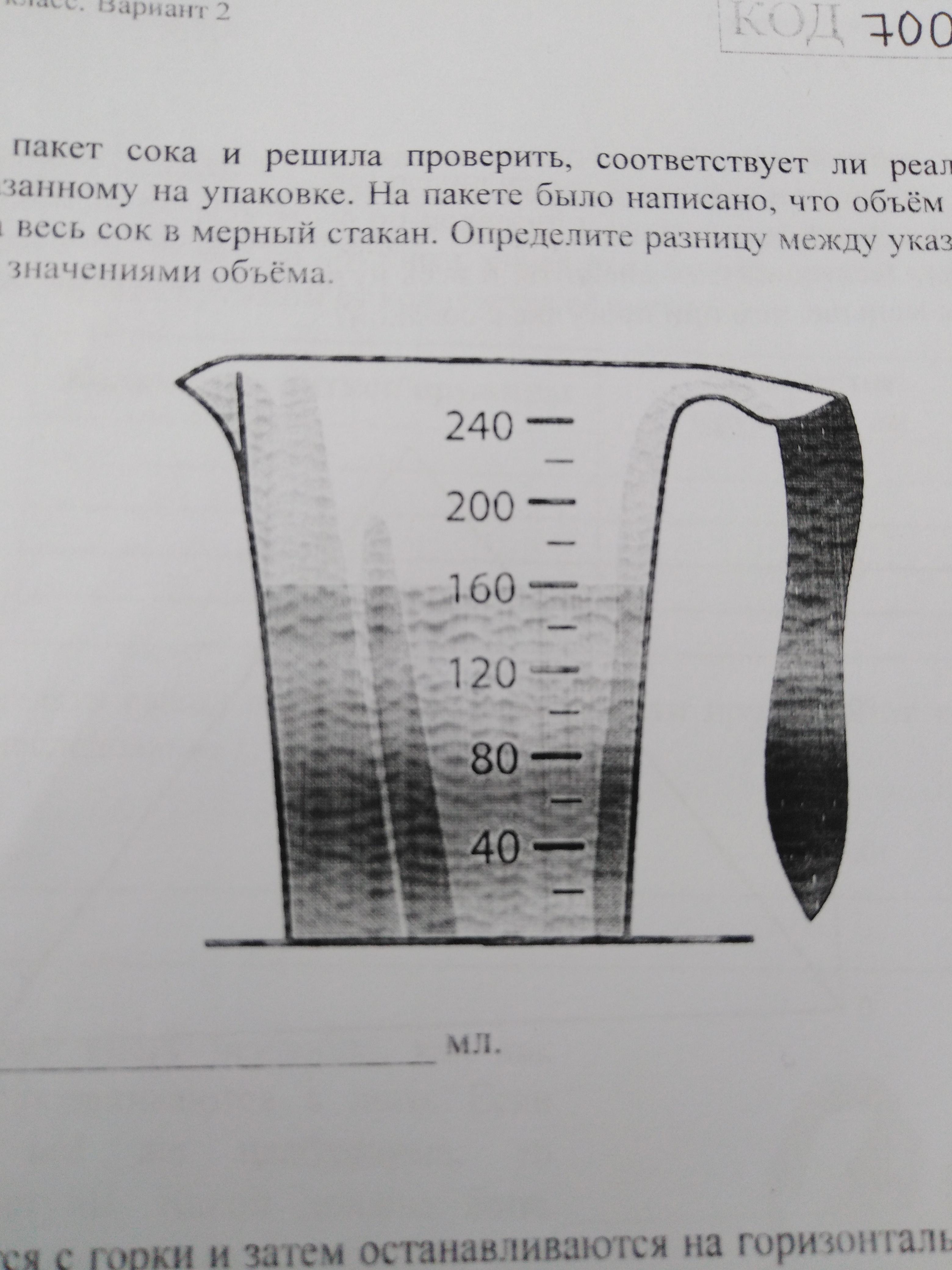 Варя купила пакет сока и решила проверить соответствует ли реальный объем сока значению, указанному на упаковке. На пакете было написано, что объем сока равен 150 мл. Варя перелила весь сок в мерный стакан. Определите разницу между указанным на упаковке и измеренным значениями объёма.