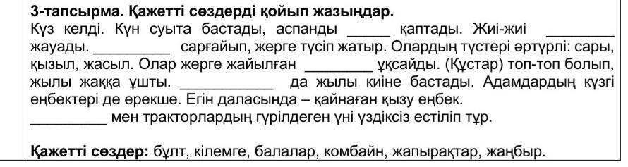 3-тапсырма. Қажетті сөздерді қойып жазыңдар.