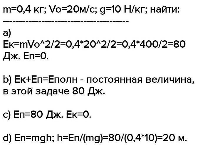 3. Тело массой 0,4 кг бросают вертикально вверх со скоростью 20 м/с. Сопротивление воздуха не учитывается, g=10 Н/кг.