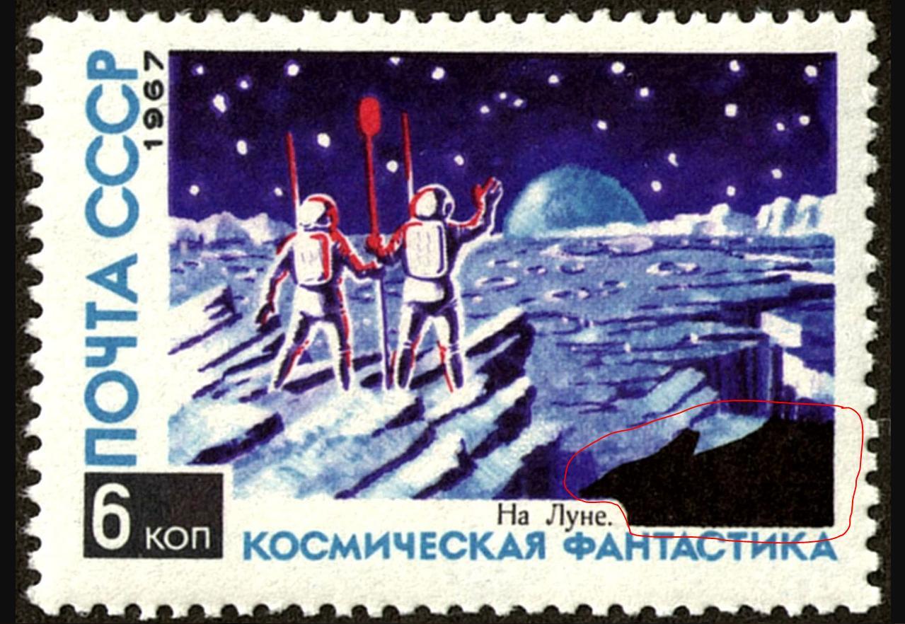 Причина: Учёные усомнились в факте, что восход Земли можно увидеть с Луны, поэтому слова "Восходит Земля" были замазаны под вид тени со скал. Тем не менее в одной из публикаций, вышедших позднее в издательстве «Наука», факт восхода Земли на Луне при определённом положении наблюдателя был подтверждён, и, следовательно, исправления на почтовой миниатюре были зря.