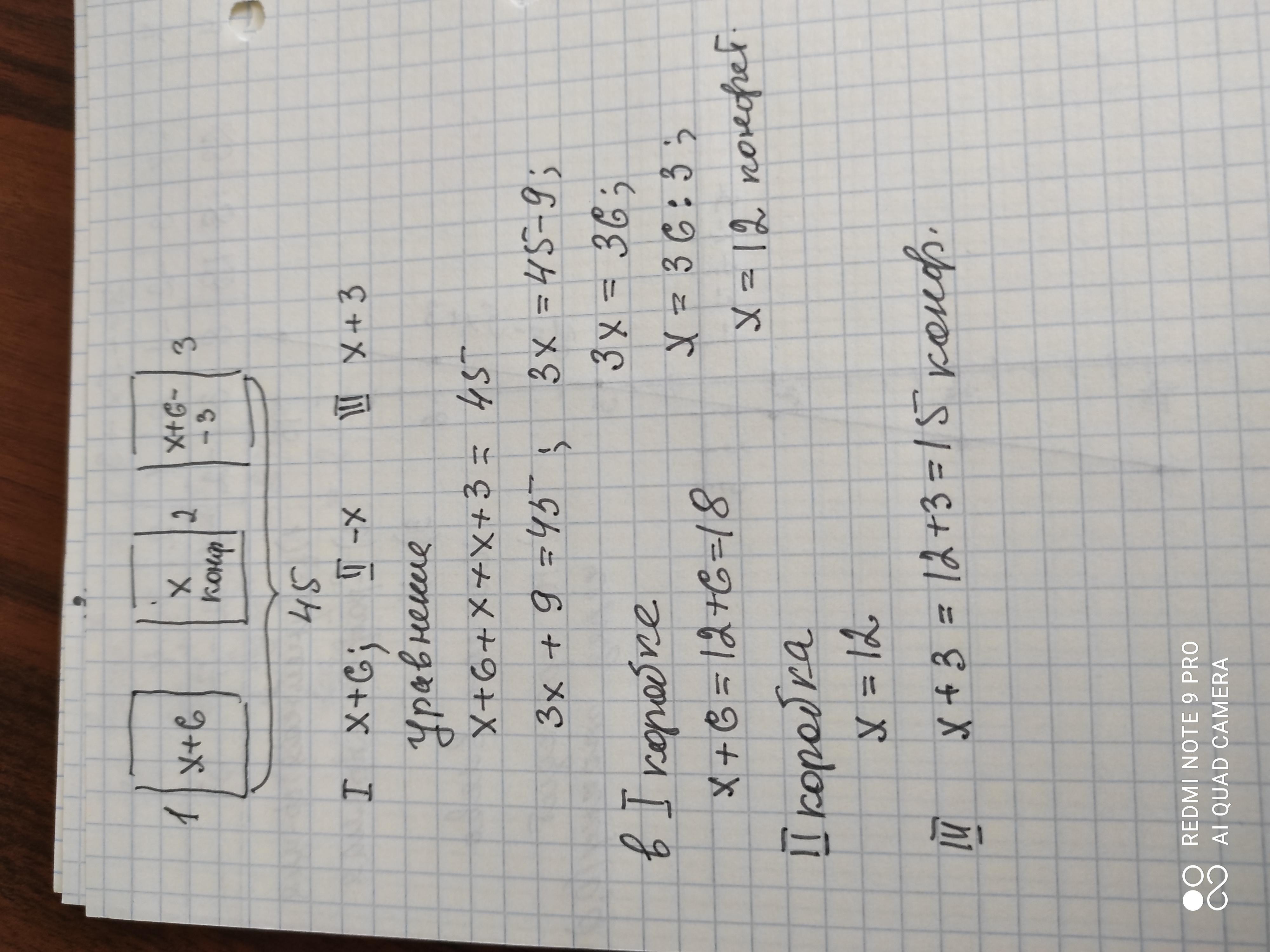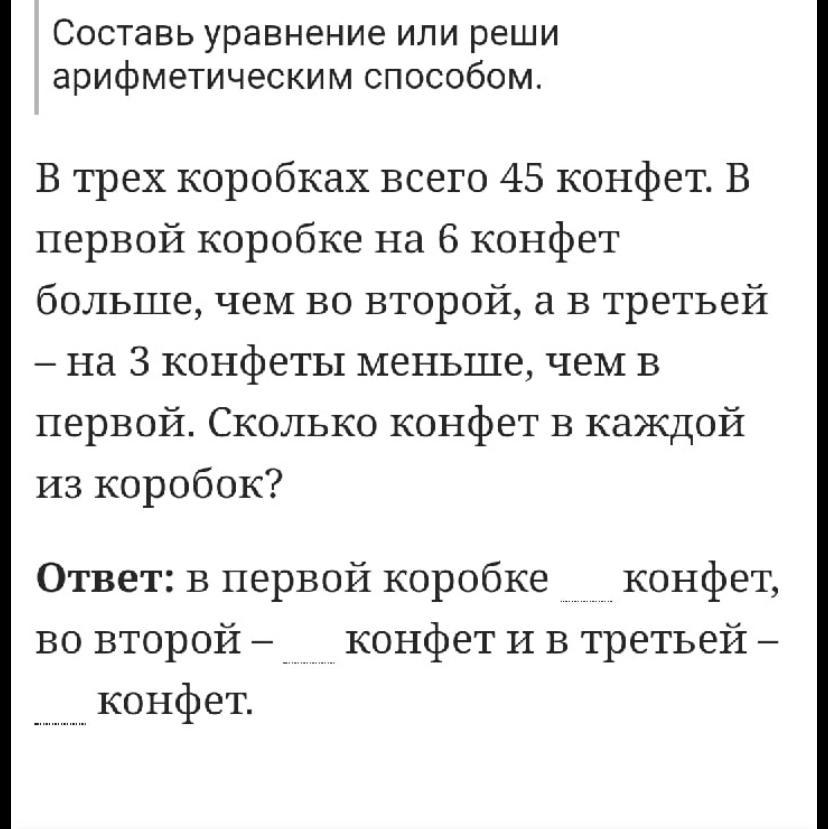 Пусть во второй коробке x конфет. Тогда в первой коробке X+6 конфет, а в третей коробке (x+6)-3 конфет.