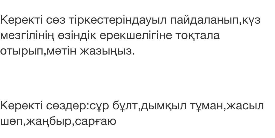 Күзде аспанды сұр бұлт қаптайды. соның әсерінен жаңбыр жауады.Жаңбыр жауғансоң үйден жылы киім киіп шығамыз.кейбір күндері дымқыл тұман жерді басады. Жәнеде жапырақтар сарғаяды