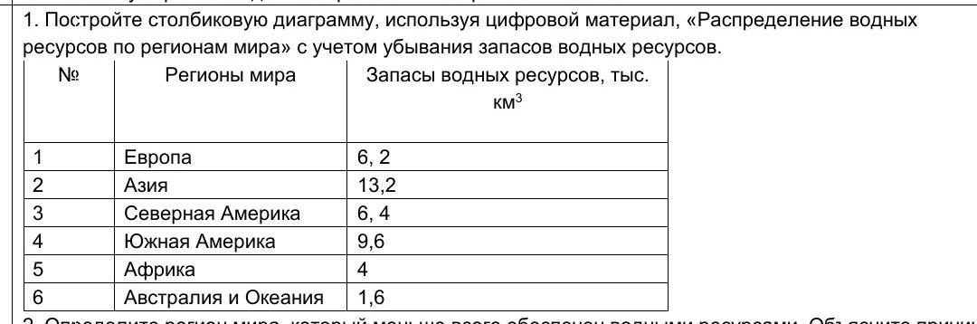 ВЫПОЛНИ 1. Постройте столбиковую диаграмму, используя цифровой материал, «Распределение водных ресурсов по регионам мира» с учетом убывания запасов водных ресурсов.