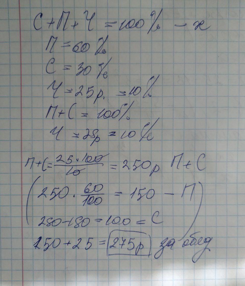 Юра обедает в столовой.На обед он взял суп ,плов и чай.Плов стоил 60%всей суммы, уплаченной за обед,суп-30%.Чай стоил 25 рублей.Сколько рублей заплатил Юра за обед?