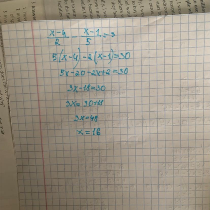 общий знаменатель 10 5^ * (X-4)-2^ * (X-1)=3^ * 105x - 20 - 2x + 2 = 30 3X = 48 X = 48/3 X = 16