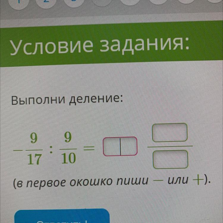 - 9/17 ÷ 9/10 = - 9/17 × 10/9 = - 9·10/17·9 = - 90/153 = - 10 · 9/17 · 9 = - 10/17