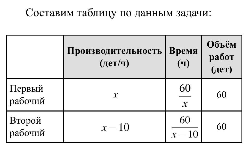 Пусть x — число деталей, изготавливаемых первым рабочим за час, x больше 10, тогда x минус 10 — число деталей, изготавливаемых вторым рабочим за час.