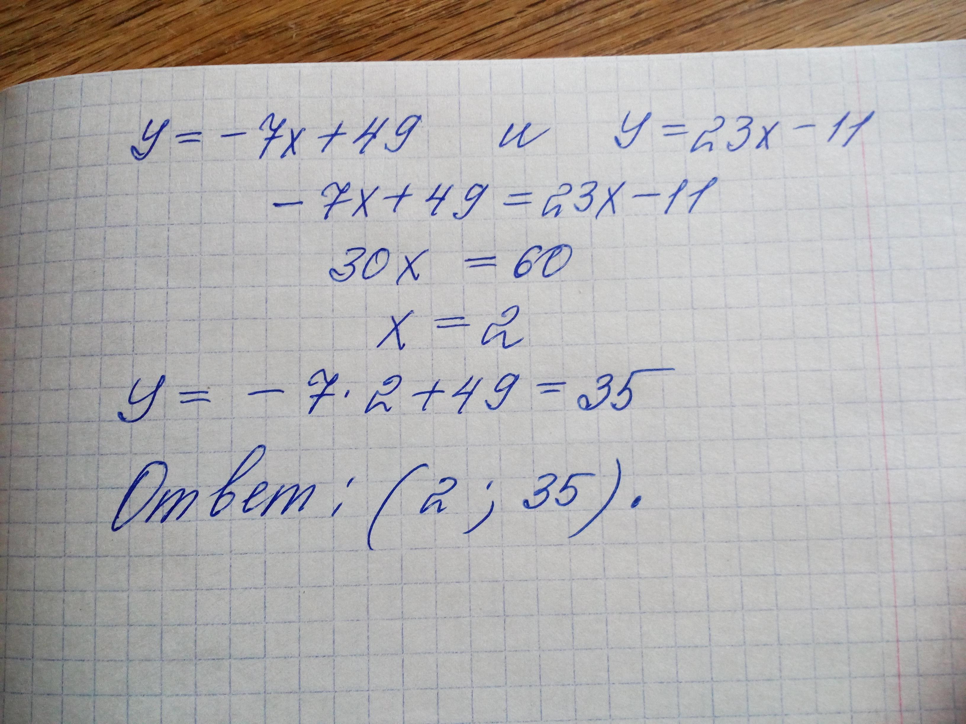 Знайди координати точки перетину графіків функції у = -7х+49 і у = 23х-11.