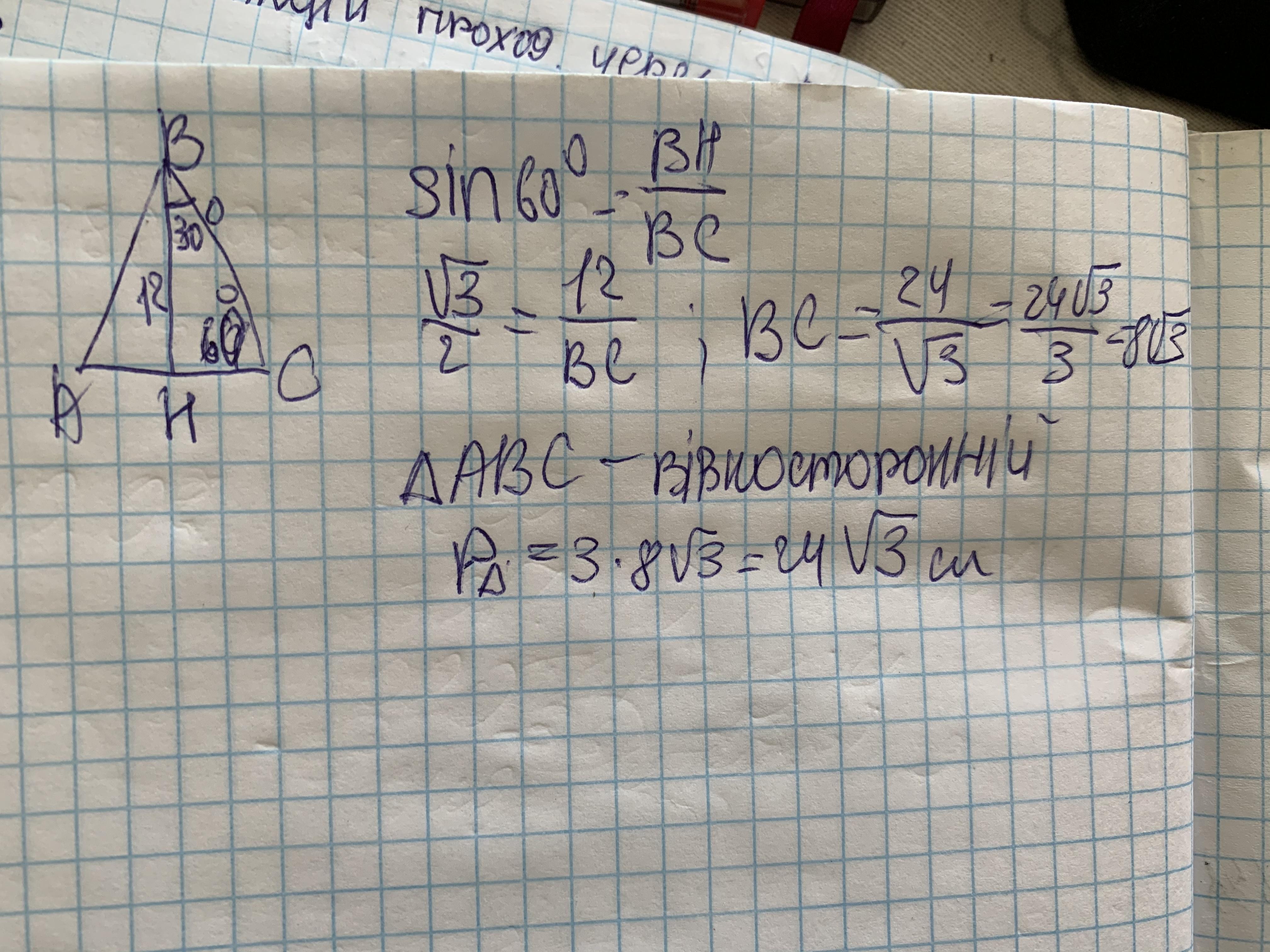 Знайти периметр рівнобедреного трикутника, висота якого проведена до основи дорівнює 12 см і утворює з бічною стороною кут 30°