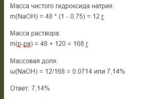 К 120 мл воды добавили 48 г раствора гидроксида натрия с массовой долей щёлочи 25% Найдите массовую долю щёлочи в полученном растворе.