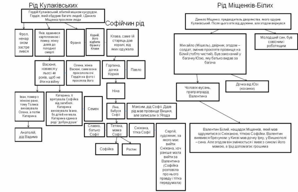 3. На мій погляд, справжньою родиною - є родина Софійки. В їньому роду з покоління в покоління передаються і шануються сімейні реліквії. Бабусі-дідусі переказують історію роду онукам, а онуки цікавлять цією історією. Наприклад, в роду Вадима Кулаківського цього немає. Крім того, що на їхній рід накладено прокляття Вадим більше нічого не знає. Ні хто був його прадід, ні в чому причина прокляття, ні чиї світлини зберігаються в сімейному архіві і хто ці люди. А головне, йому не цікаво це знати! Род Міщенків після втечі Данила Міщенка, взагалі почав розсипатися. Зміна прізвища не тільки не дала шансу їхній родині на початок життя з нового чистого аркуша, а ніби підвела риску під існуванням давнього шанованого роду.