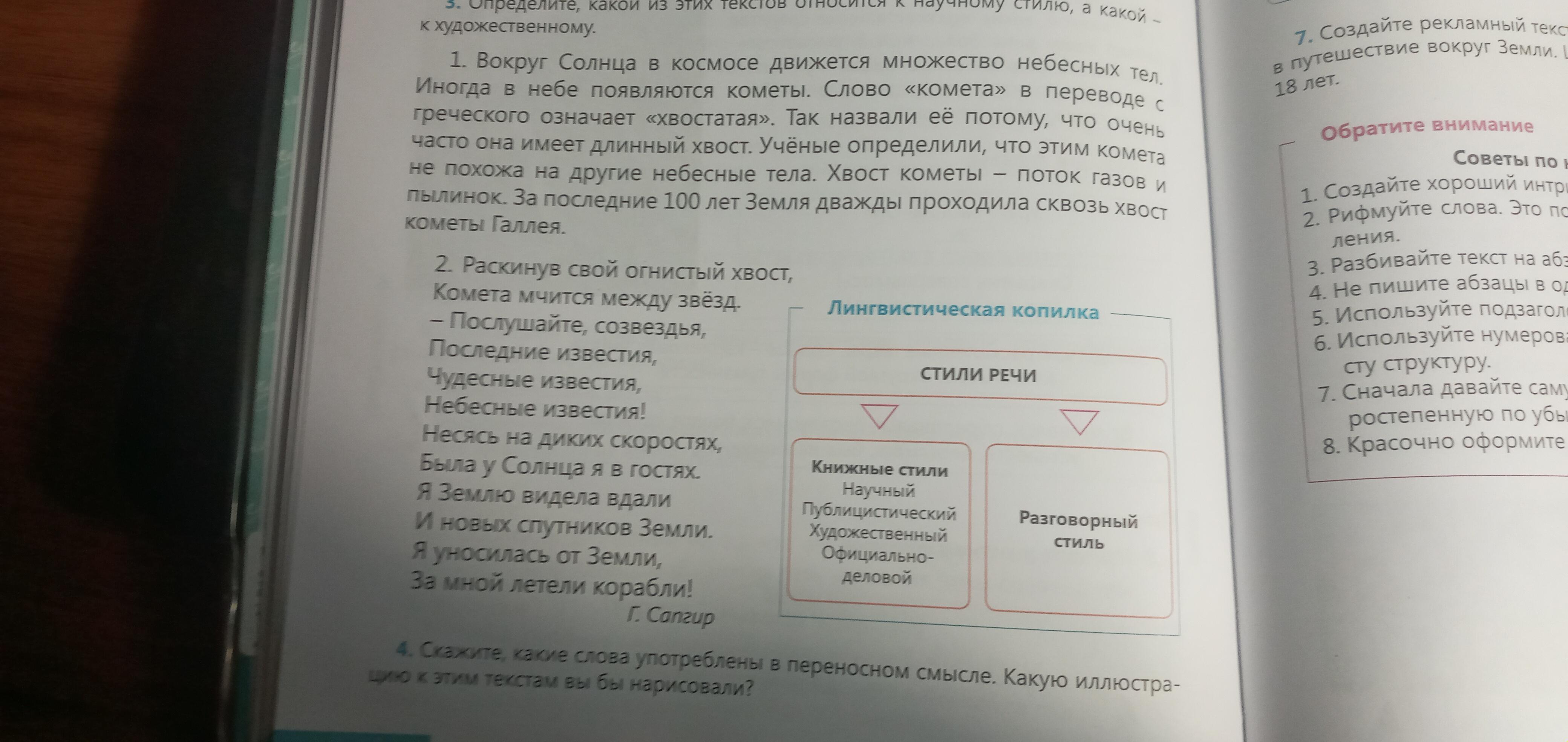Ответь(устно): 1. текст про космос 2. это тоже текст про космос только в виде стиха. научный стиль: 1 текст. художественный: 2 текст
