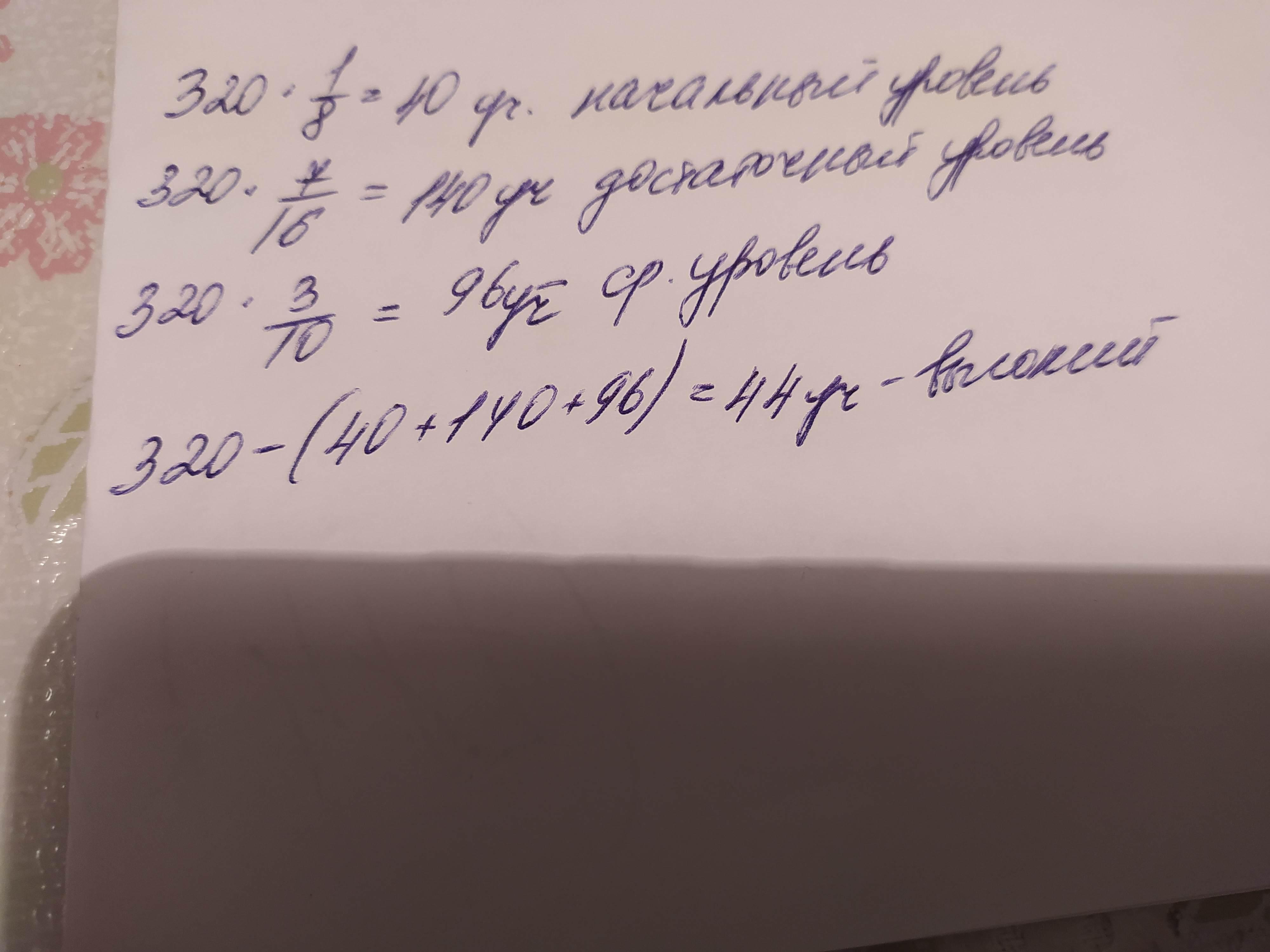 У школі 320 учнів ,1/8 з них навчається на початковий рівень ,7/16 на достатній рівень ,3/10 на середній рівень..А решта на високий .скільки учнів мають високий рівень знань ?