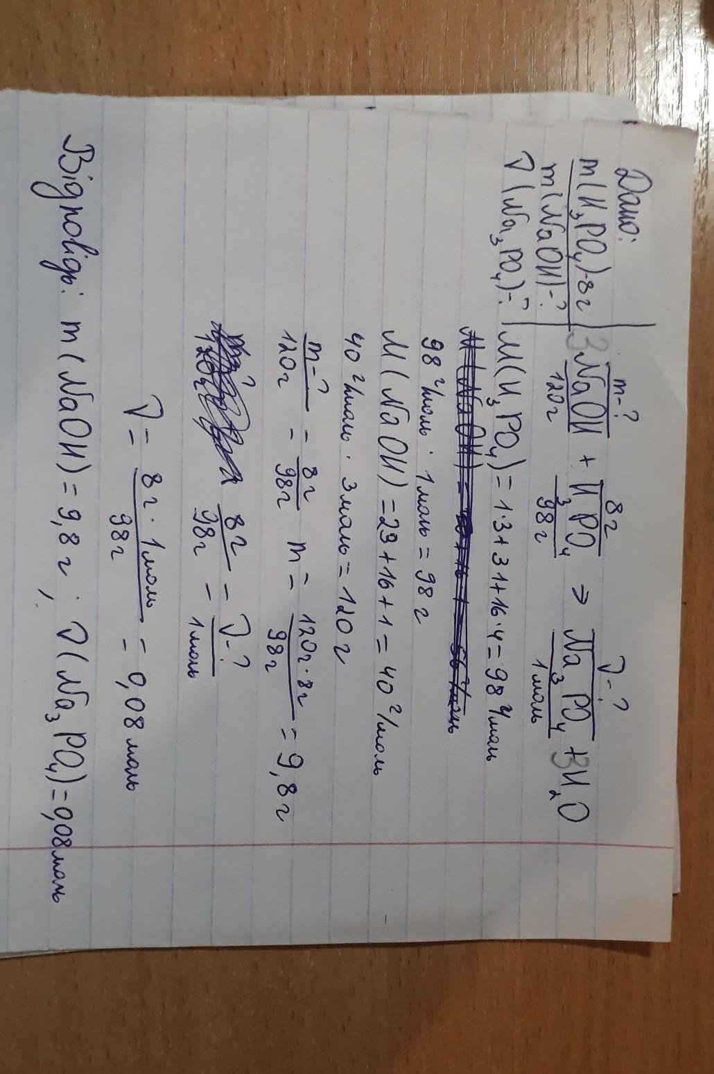 Яку масу гідроксиду натрію необхідно для нейтралізації 8гр ортофосфатної кислоти? Яка кількість речовини солі утворилась?