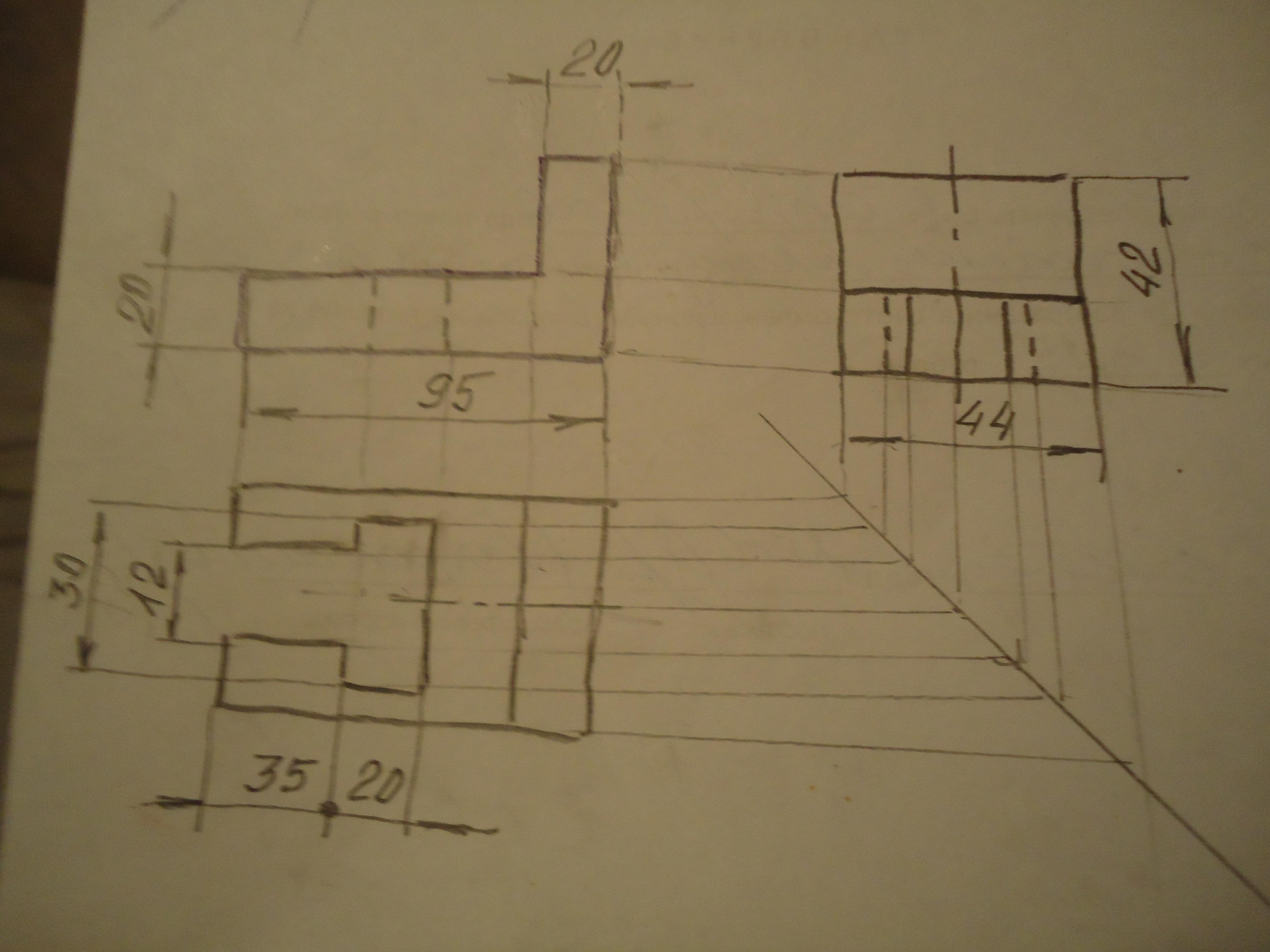 Чертёж детали из трёх проекций, выполненный от руки с сохранением пропорций на глаз, см. на фото.