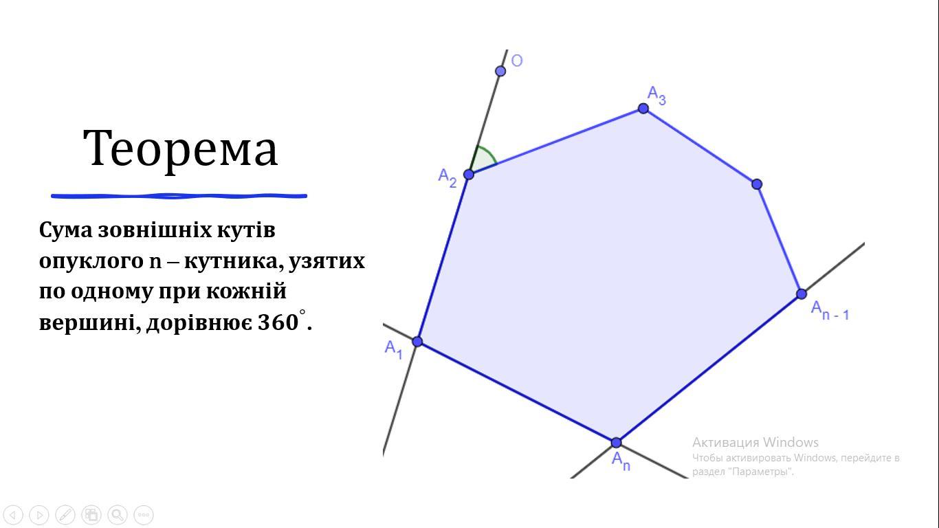 За теоремою сума зовнішніх кутів опуклого многокутника 360°.