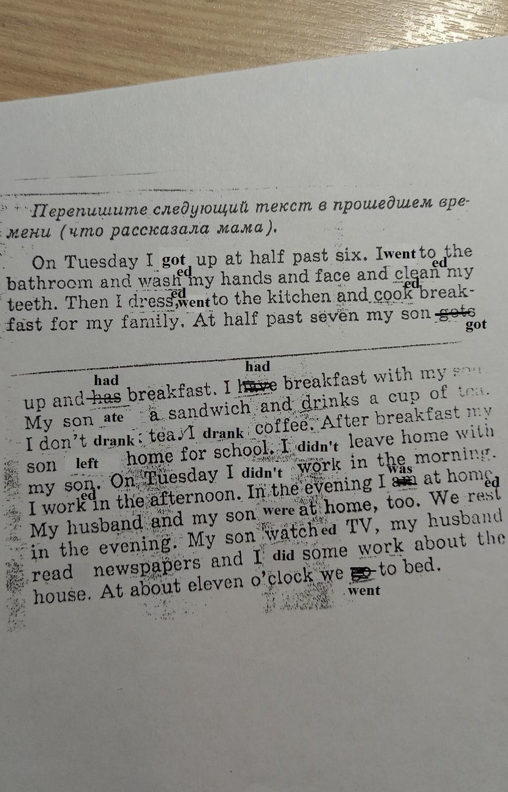 on Tuesday I got up at half past six. I went to the bathroom and washed my hands and face and cleaned my teeth. Then I dressed, went to the kitchen and cooked breakfast for my family. At half past seven my son gots up and had breakfast. I had breakfast with my son. My son ate a sandwich and drank a cup of tea. I didn't drink tea. I drank coffee. After breakfast my son left home for school. I didn't leave home with my son. On Tuesday I didn't work in the morning. I worked in the afternoon. In the evening I was at home. My husband and my son were at home, too. We rested in the evening. My son watched TV, my husband read newspapers and I did some worked about the house. At about eleven we went to bed.