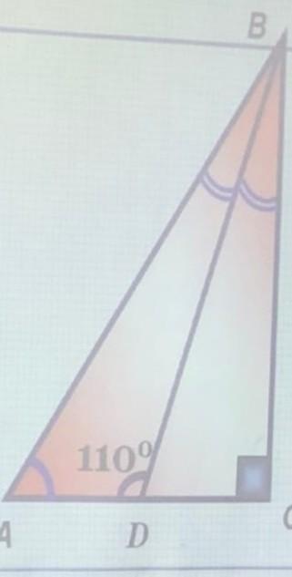 Внешний угол в 110° равен сумме двух внутренних углов, не смежных с ним, т.е. ∠С+∠В⇒∠В=110°-∠С=110°-90°=20°, т.к. ВD- биссектриса угла В, то ∠В=2*20°=40°.