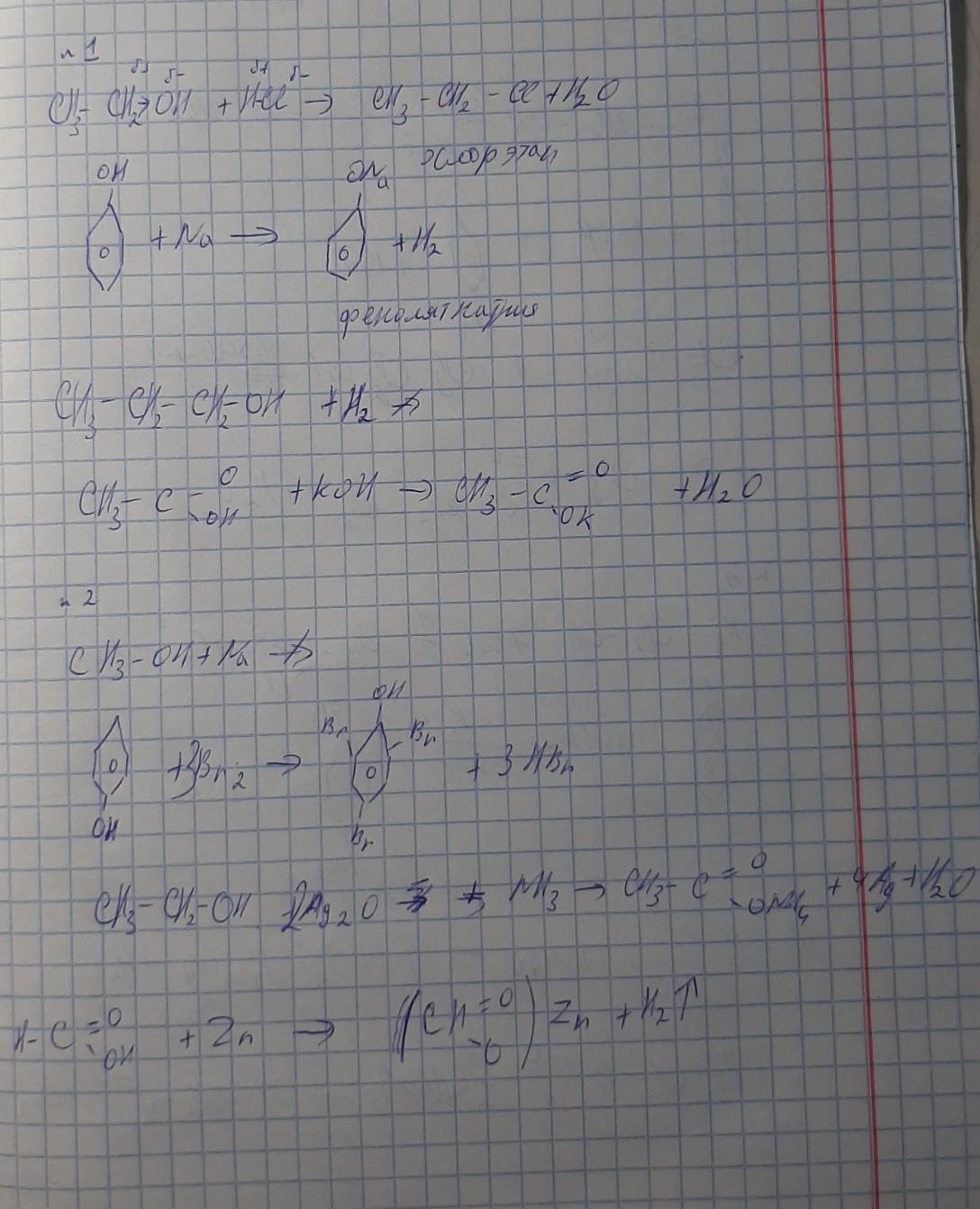 1) Этанол+HCl; фенол+Na; пропанол+H2; уксусная кислота+KOH.