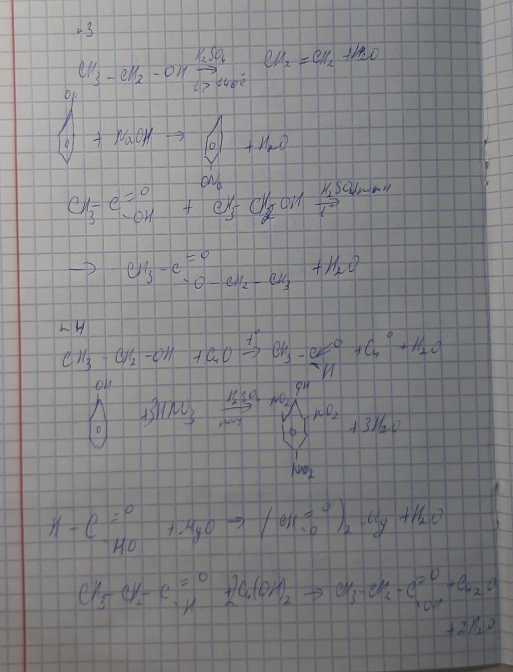 3)Дегидратация этанола; фенол+NaOH; уксусная кислота+этиловый спирт.