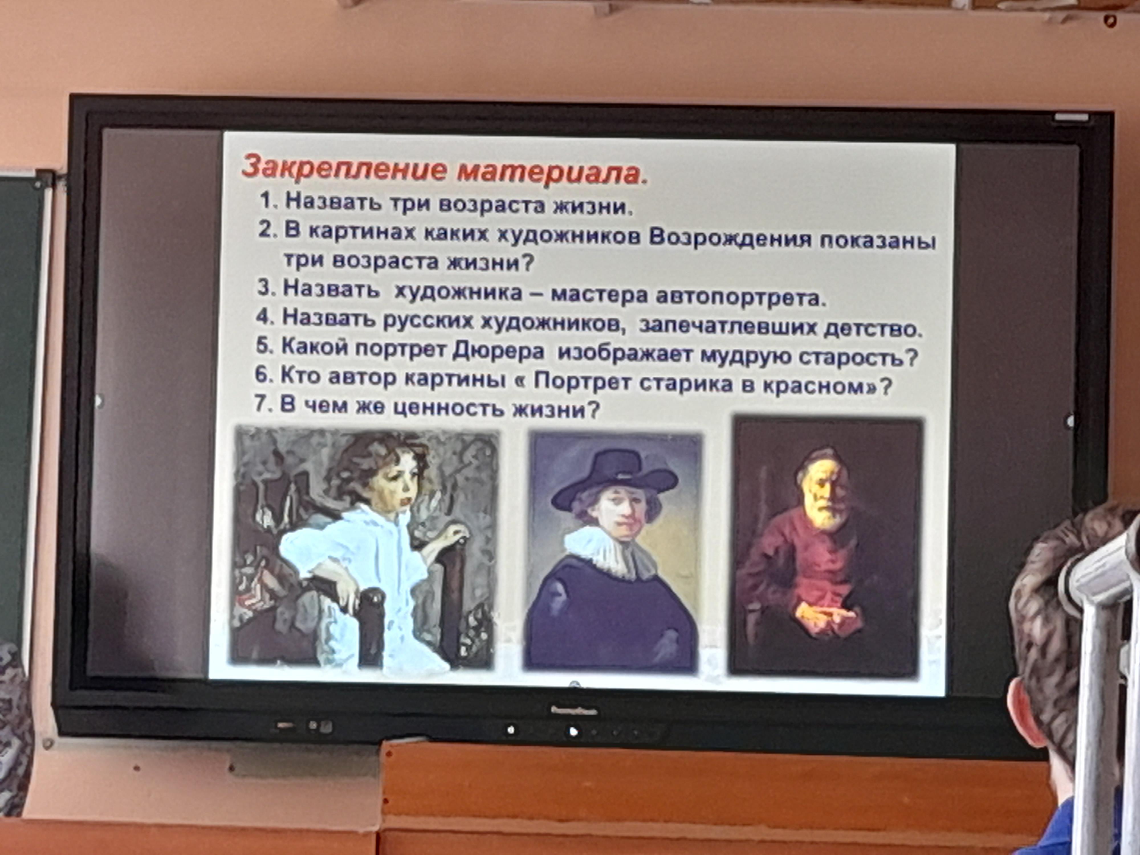Закрепление материала. 1. Назвать три возраста жизни. 2. В картинах каких художников Возрождения показаны три возраста жизни? 3. Назвать художника – мастера автопортрета. 4. Назвать русских художников, запечатлевших детство. 5. Какой портрет Дюрера изображает мудрую старость? 6. Кто автор картины « Портрет старика в красном»? 7. В чем же ценность жизни?