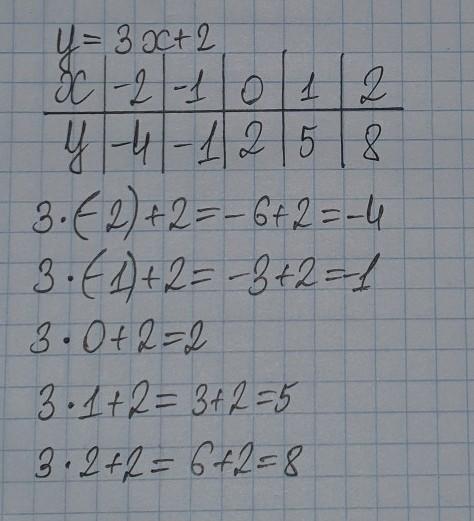 Зависимость переменной х задается следующей формулой: у=3х+2. Представь зависимость в виде таблицы, где переменная х принимает значения [-2;2] с шагом 1.