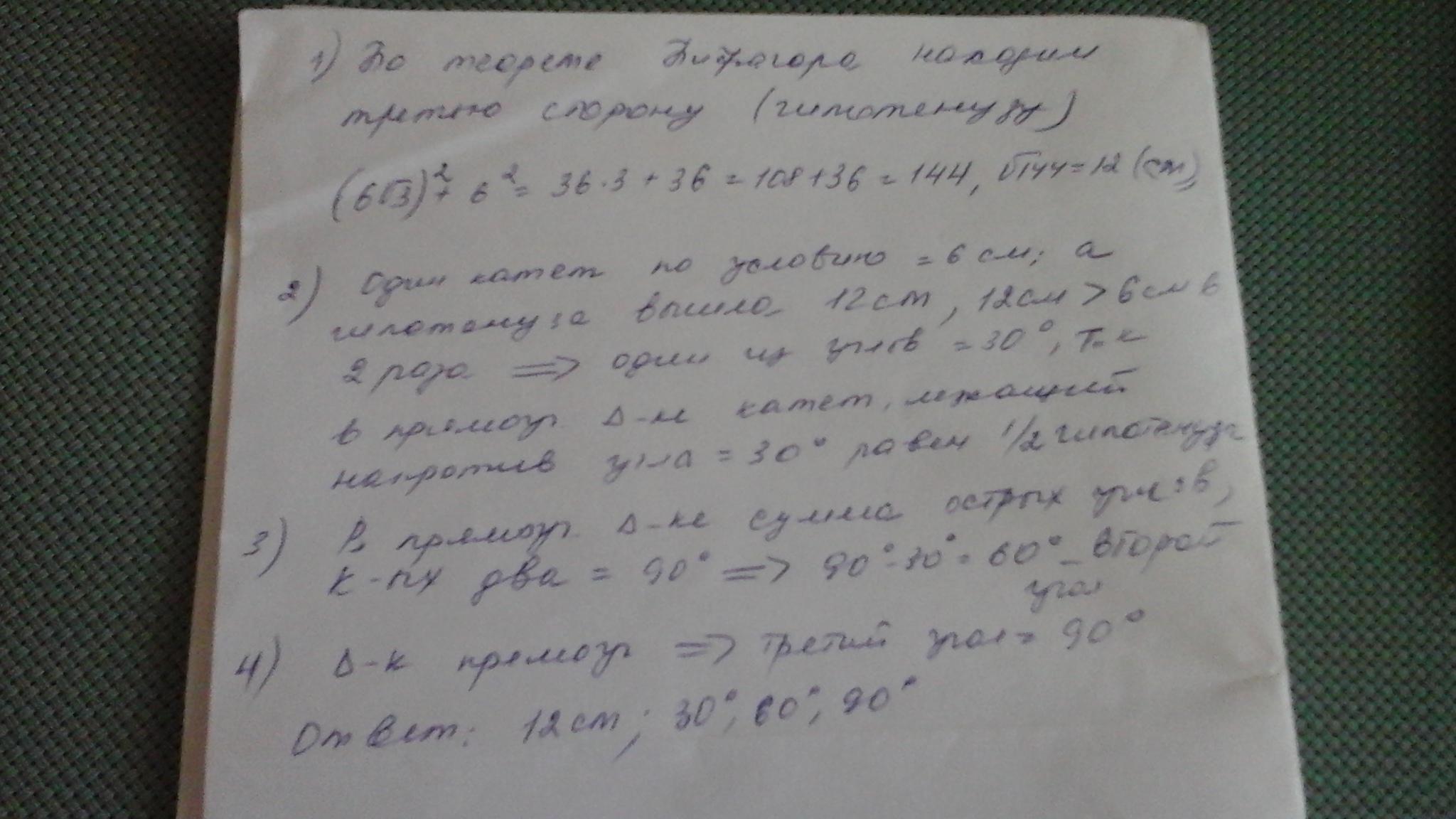 Найдите неизвестные стороны и углы прямоугольного треугольника, если его катеты равны 6√3см и 6см.
