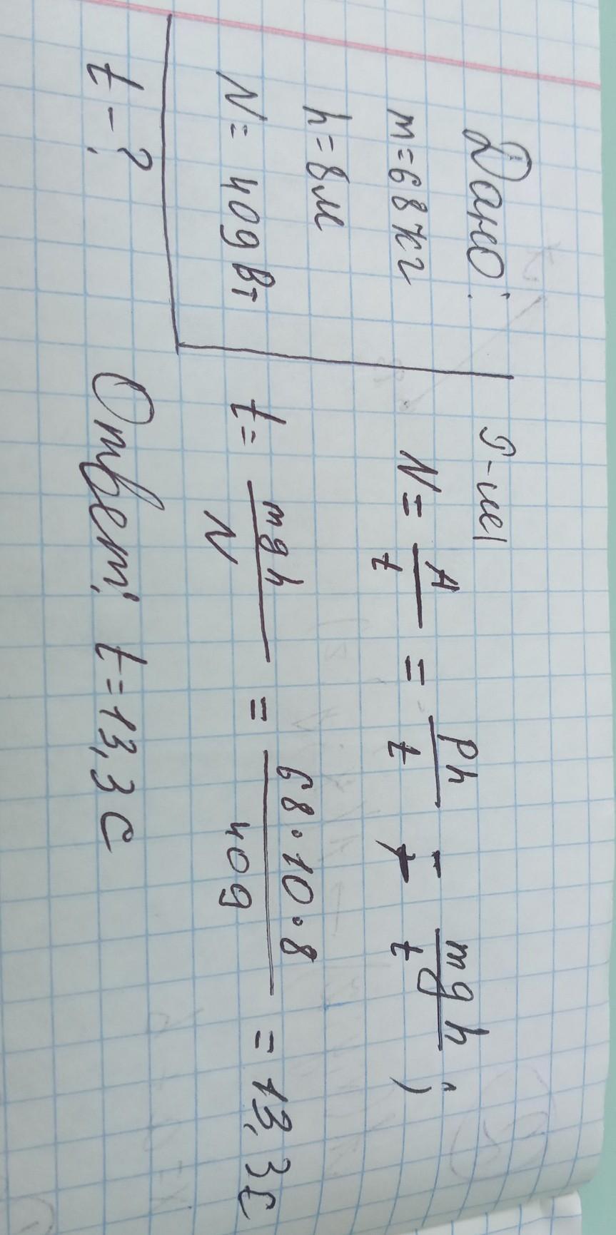 Дано: m=68 кг; h=8 м; Р=409 Вт; t - ?