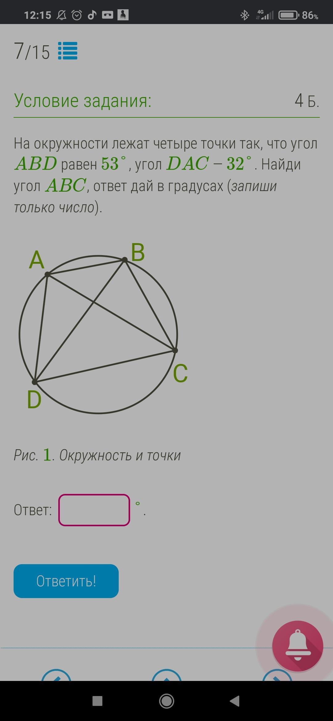 На окружности лежат четыре точки так, что угол ABD равен 53°, угол DAC — 32°. Найди угол ABC, ответ дай в градусах (запиши только число).